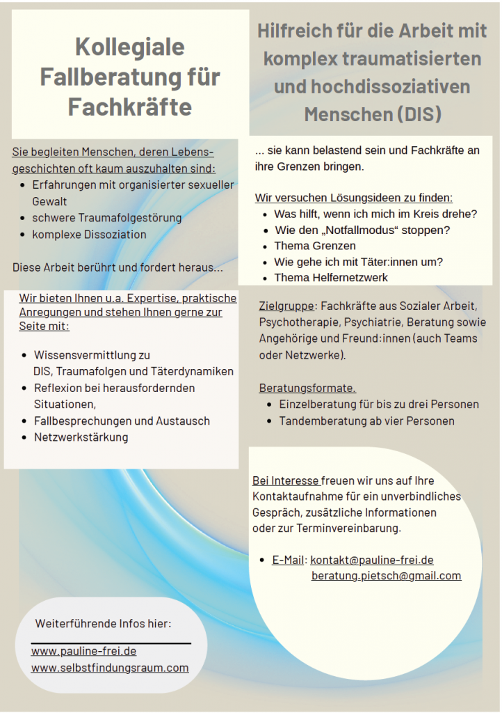 Die Arbeit mit schwer traumatisierten Menschen insbesondere mit hochdissoziativen Menschen kann auch für Helferinnen und Helfer sehr belastend werden und bringt sie oft an ihre Grenzen. Gemeinsam können wir unsere Kompetenzen bündeln und die nächsten Schritte für Sie und ihre Klientinnen und Klienten planen.